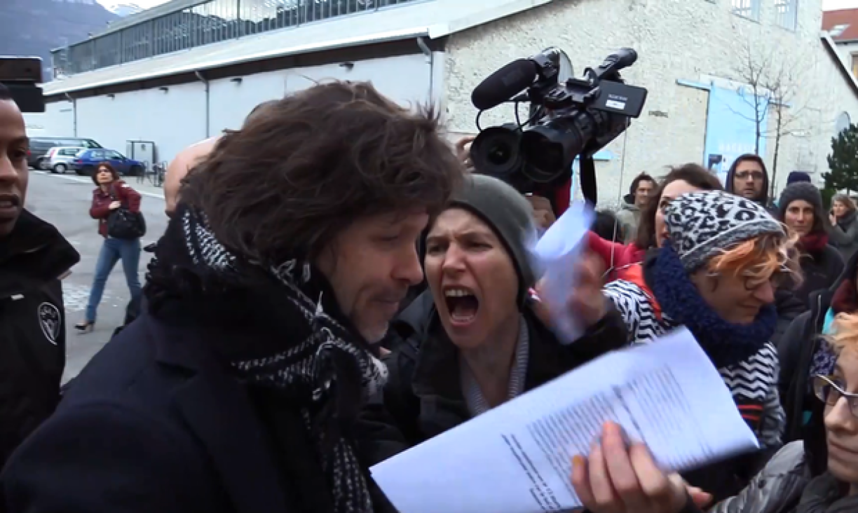 Sur des vidéos diffusées par le quotidien Le Dauphiné libéré et la radio France Bleu Isère, on peut voir les manifestants crier “assassin!” et “casse-toi!” et lancer des projectiles en direction du chanteur, entouré de vigiles. Ces derniers tentent de contenir la bousculade.
