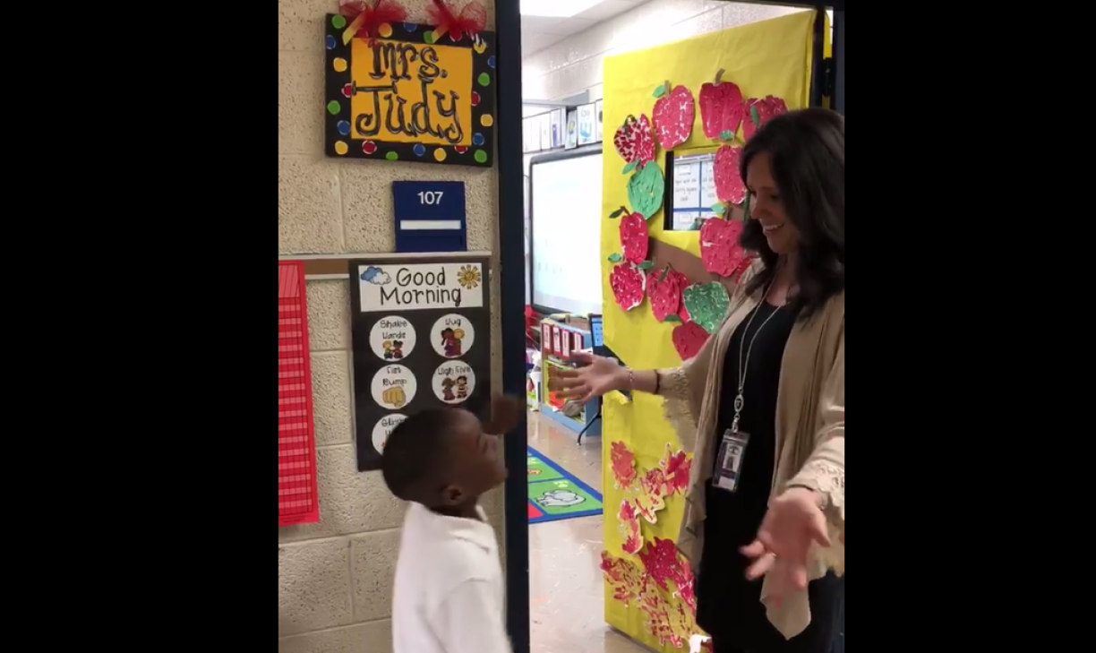 Avant d’entre en classe, les élèves montrent de quelle manière ils veulent saluer leur institutrice. Ils peuvent choisir entre six options différentes: se prendre dans les bras, un high-five, une petite danse,...