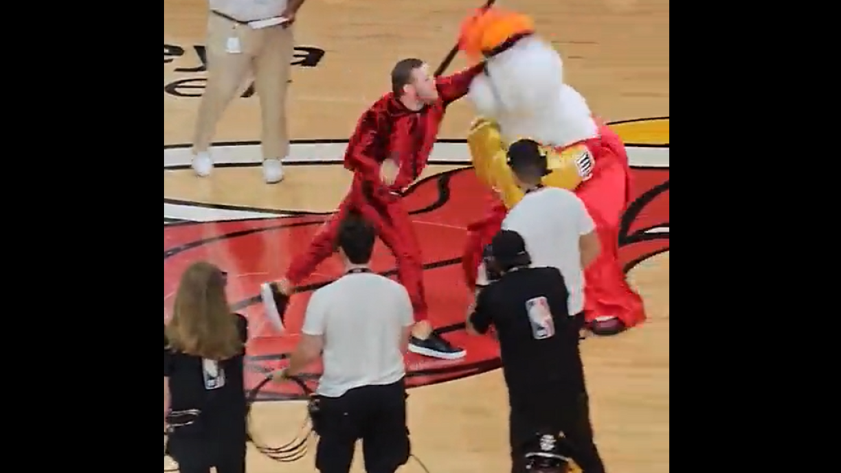 Lors du match 4, le spectacle devait également se dérouler durant un temps mort: une simulation de combat était organisée entre Conor McGregor, la star du MMA, et la mascotte du Heat, “Burnie”, qui est une représentation de la boule de feu visible sur le maillot de Miami, aux airs de perroquet. Sauf que le combattant, à la retraite depuis deux ans et qui faisait la promotion de son spray anti-douleur, y est allé “un peu” plus fort que prévu.