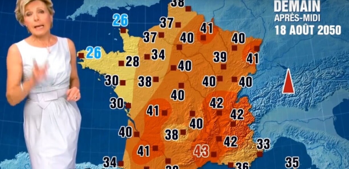 “Dans l’après-midi on dépassera encore les 40 degrés, 41 à Agen, 41 à Strasbourg, 40 degrés à la capitale”, déclarait alors Évelyne Dhéliat, prévoyant, avec l’aide de Météo France, ces températures pour août 2050.