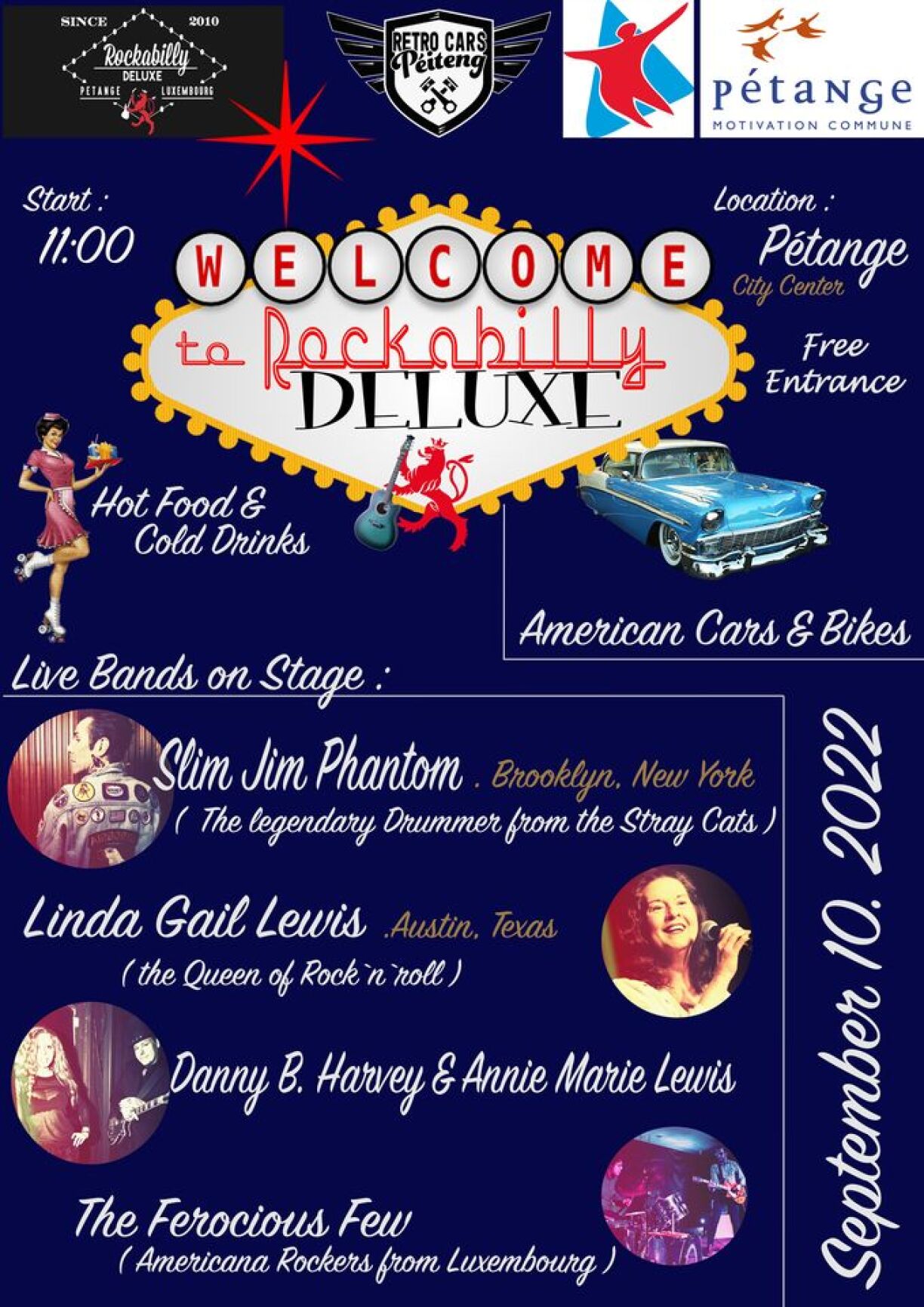 Le festival gratuit Rockabilly Deluxe est de retour à Pétange ce samedi. Slim Jim Phantom, Linda Gail Lewis, Danny B. Harvey & Annie Marie Lewis et The Ferocious Few seront présents. Préparez-vous à passer un bon moment. Il n’y aura pas seulement de la musique, mais aussi de la nourriture américaine et des voitures!