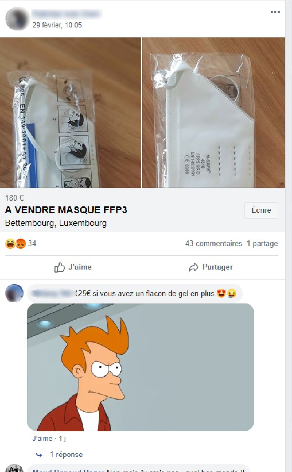Ce qui fait tousser avec l’annonce ci-dessus, c’est d’abord le prix: 180 euros! (pour un seul masque). Publiée fin février sur la page “Bonnes affaires au Luxembourg” (l’annonce a depuis été actualisée en précisant que le masque avait été vendu), elle a évidemment fait réagir de nombreux internautes, certains se demandant si c’est une (mauvaise) blague, d’autres dénonçant un “profiteur”... Mais dans tous les cas, le prix n’est pas le seul problème.