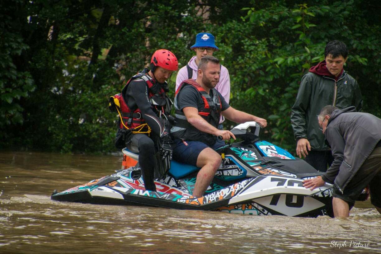 Alors que des habitants se retrouvaient coincés chez eux en raison de la montée des eaux, les deux hommes ont embarqué leur jet-ski.