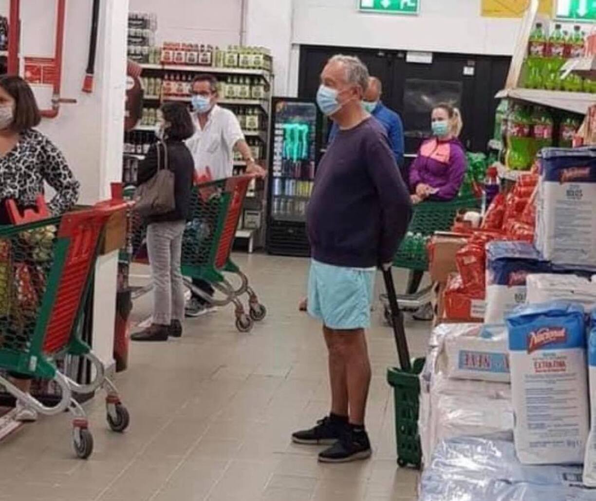 Marcelo Rebelo de Sousa, le président du Portugal, est un citoyen comme les autres... L’homme fait ses courses tout seul et en toute simplicité comme le prouve cette photo prise dans un supermarché de Cascais. C’est en short et avec un masque que le président élu en 2016 a été immortalisé dans la file d’attente.