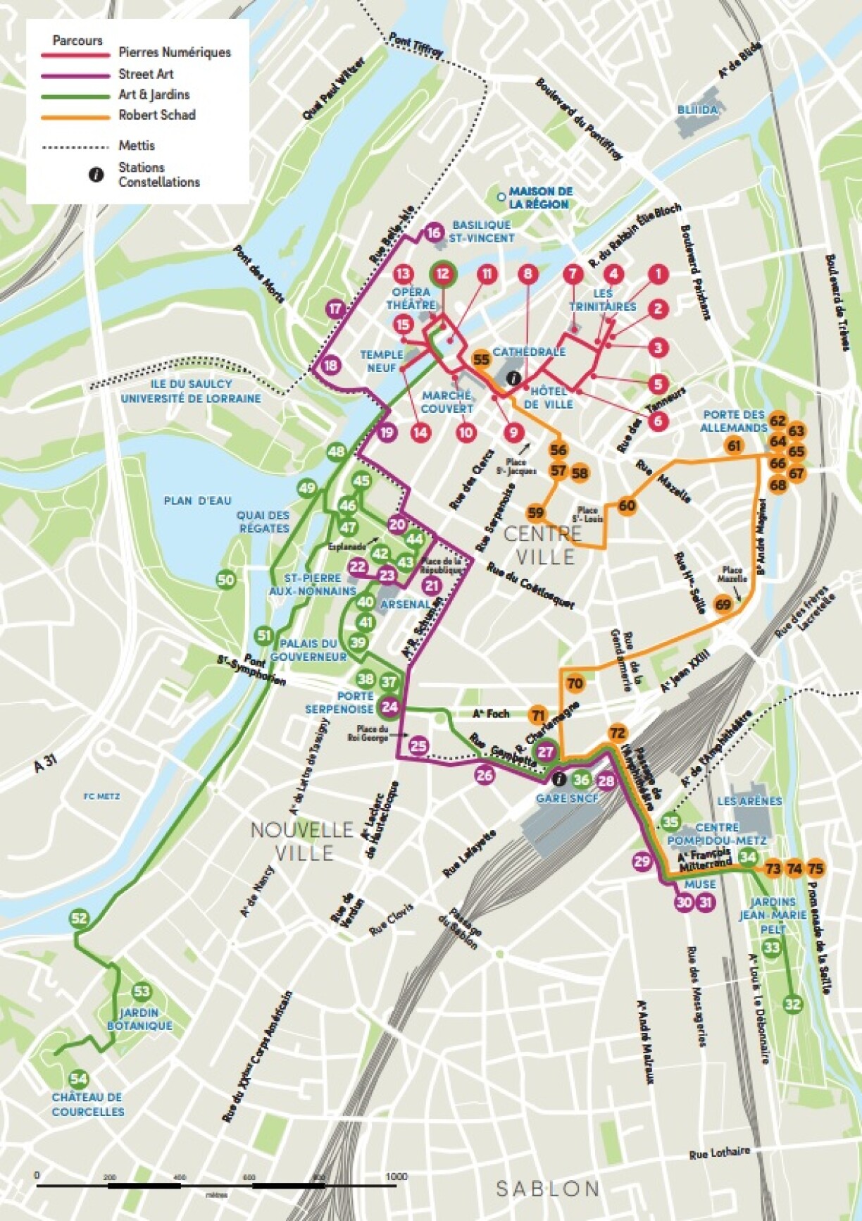 En parallèle de la projection, plusieurs parcours de marche dans la ville ont été créés afin de (re)découvrir Metz au fil de nombreuses oeuvres disséminées dans la ville.