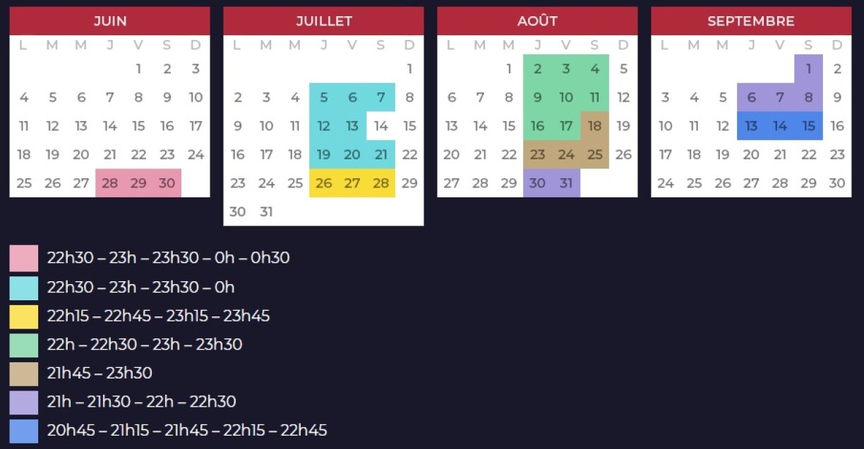 Le mapping vidéo aura lieu les jeudis, vendredis et samedis soirs de juin, juillet, août et septembre. Seul le soir de la fête nationale, le 14 juillet, marquera une pause dans la projection. Le planning complet et les horaires de diffusion sont disponibles ici: