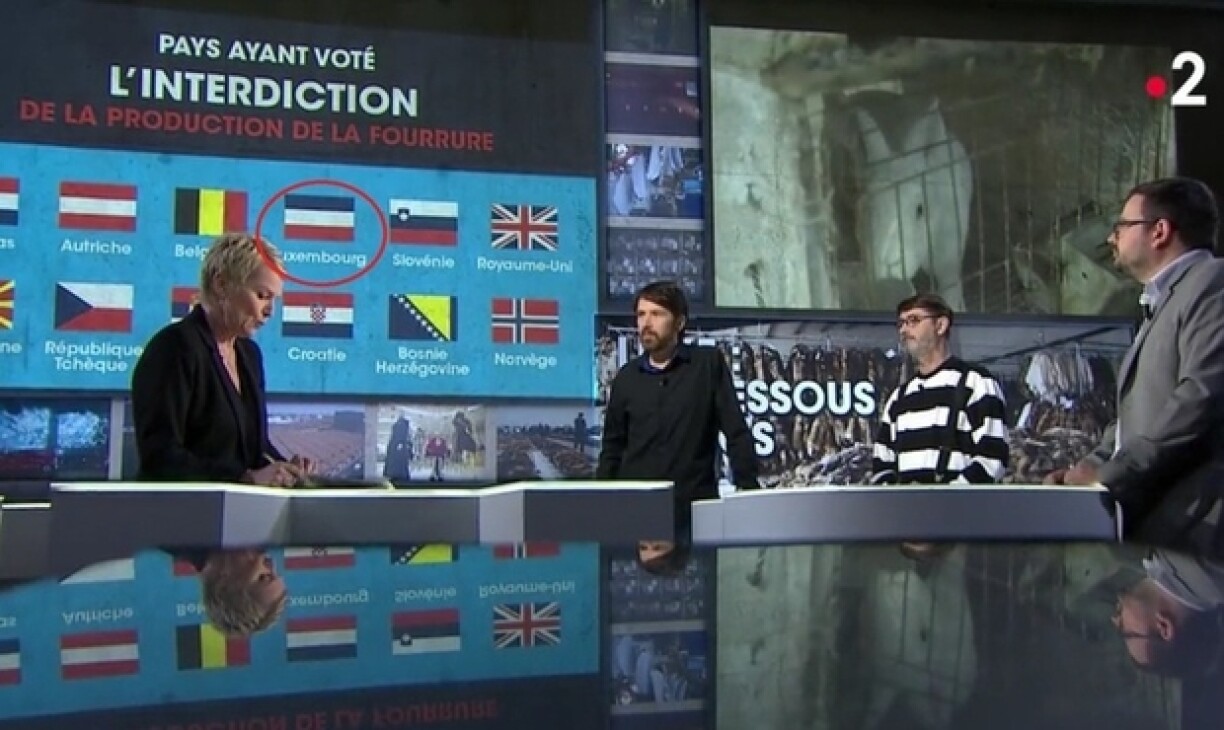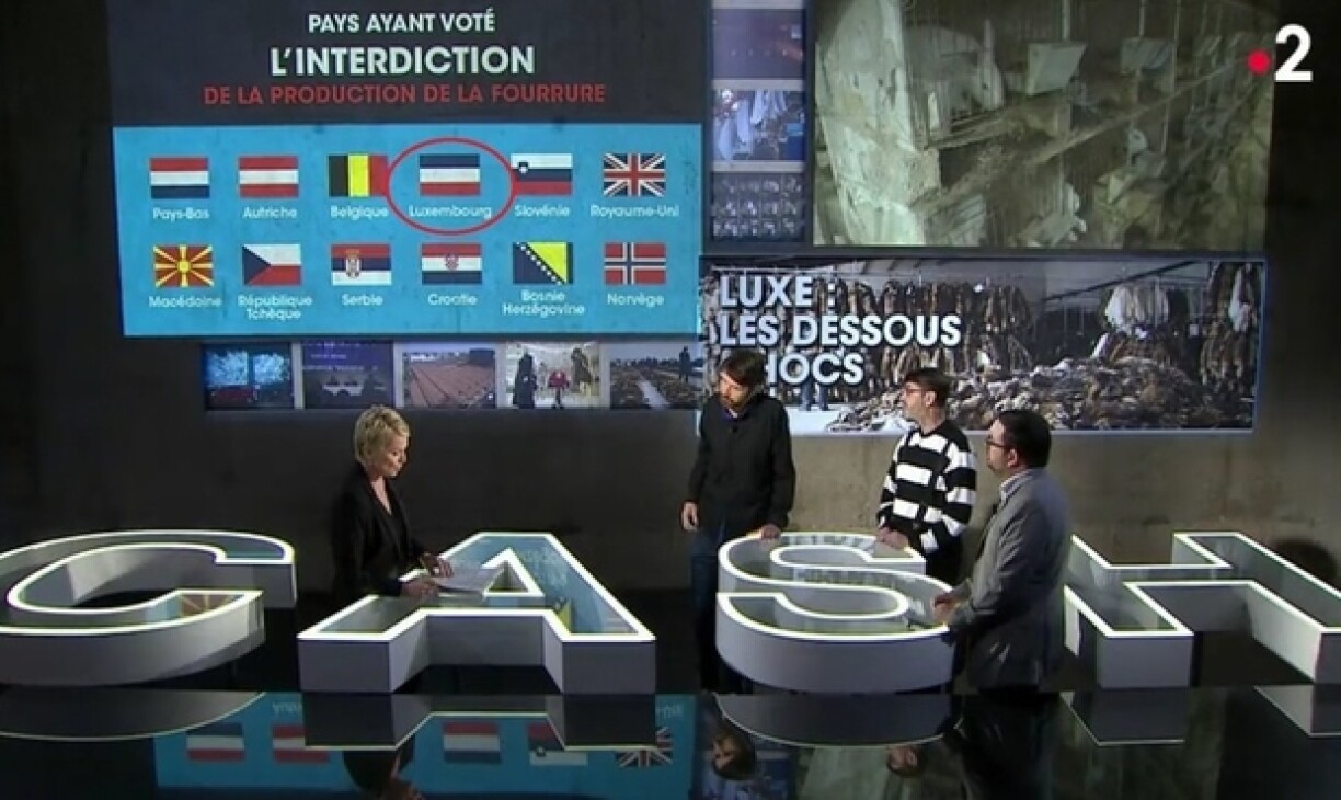 Le programme dédié aux enquêtes présentait les nations qui avaient déjà interdit la production de fourrure, lorsqu’une erreur s’est immiscée sur l’infographie, affichée derrière Elise Lucet : le drapeau luxembourgeois n’était pas conforme à sa version officielle. Il a été reproduit à l’envers ! Soit bleu-blanc-rouge au lieu de rouge-blanc-bleu clair.