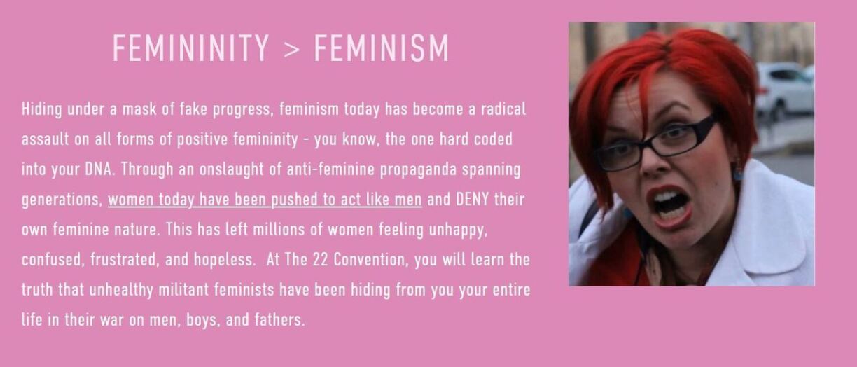 Selon les organisateurs, le féminisme est synonyme d’une femme malheureuse voire furieuse, qui fait tout pour ressembler aux hommes. Toujours selon eux, les féministes sont une “fausse preuve d’évolution” pour toute la société. La femme idéale quant à elle est représentée assise dans un pré, calme avec une jolie robe blanche et un panier rempli de fleurs...