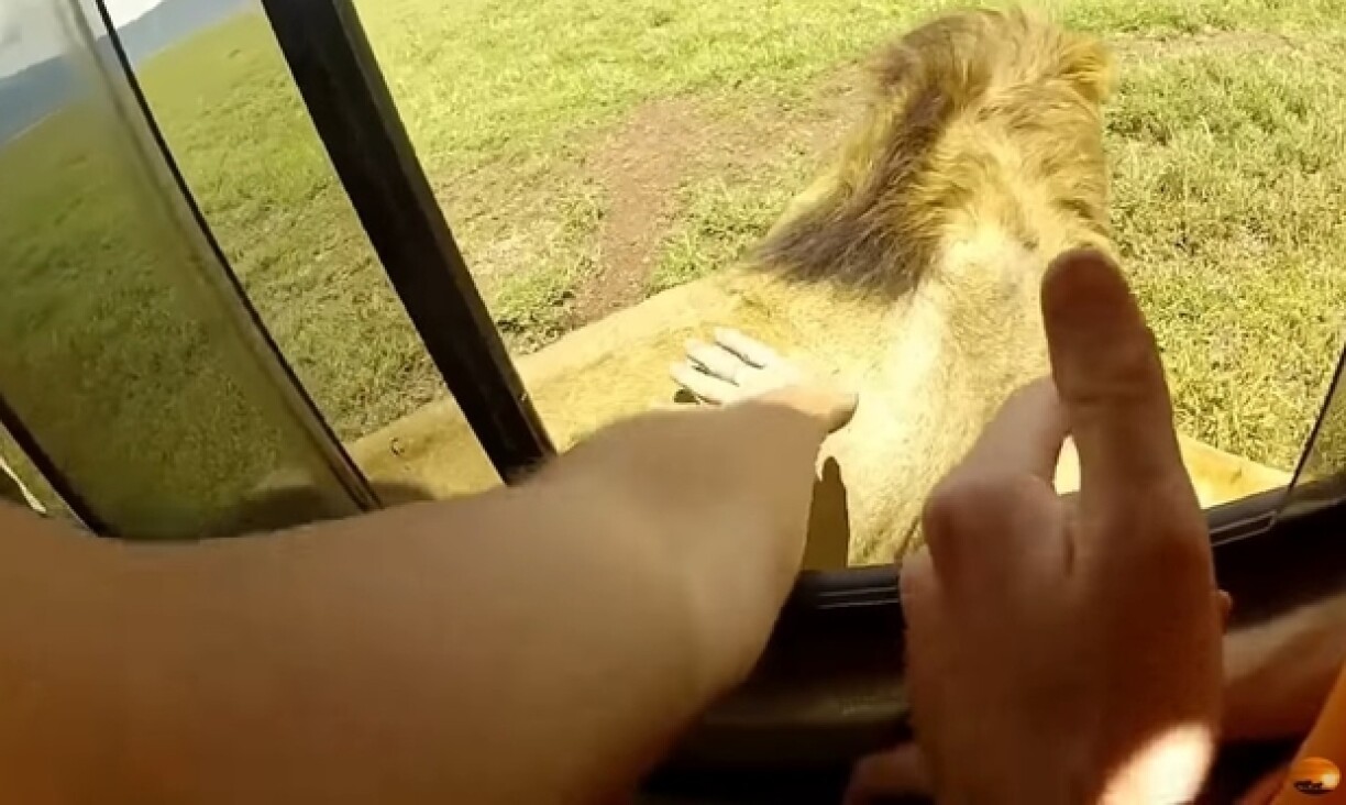 Une fois son bras passé au-dehors de la jeep, on le voit rapidement caresser le lion. Ce dernier finit par se retourner et gratifie les deux imprudents d’un rugissement, les crocs bien sortis. Espérons, pour eux, qu’on ne les y reprenne pas.