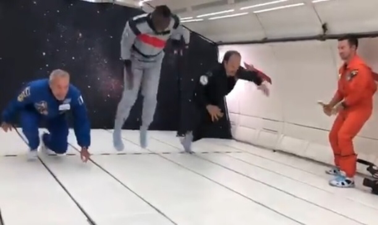 La séquence, très fun, a été filmée dans un avion Zero-G d’Airbus dans le cadre de la promotion de la nouvelle bouteille développée par la maison de champagne Mumm. Elle a missionné le designer français Octave de Gaulle de créer une bouteille de champagne qui pourrait se boire dans l’espace.