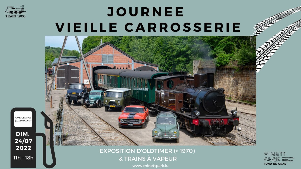Si vous êtes amateurs d’anciennes voitures et de classiques, ne manquez surtout pas la Journée Vieille Carrosserie. Plus de 130 voitures datant d’avant 1970 et bichonnées par des collectionneurs de toute la Grande Région se rejoignent ce dimanche à 11 heures au Fond-de-Gras. Il y aura de la musique, un délicieux buffet de grillades estivales et bien sûr de nombreuses machines à découvrir. Vous pourrez rejoindre Le Fond-de-Gras à bord du légendaire Train 1900 depuis son quai de départ à Pétange (rue de Niederkorn). Le train minier “Minièresbunn” assurera également plusieurs départs.