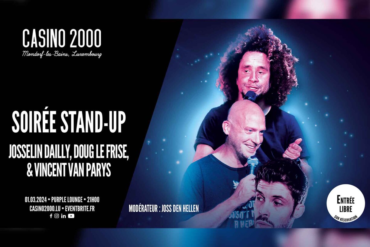 Et lors de cette soirée qui sera présentée par l’humoriste préféré des Luxembourgeois, Joss Den Hellen, vous découvrirez aussi le talent de Vincent Van Parys, qui vous présentera ses punchlines acérées et ses commentaires caustiques sur l’actualité !