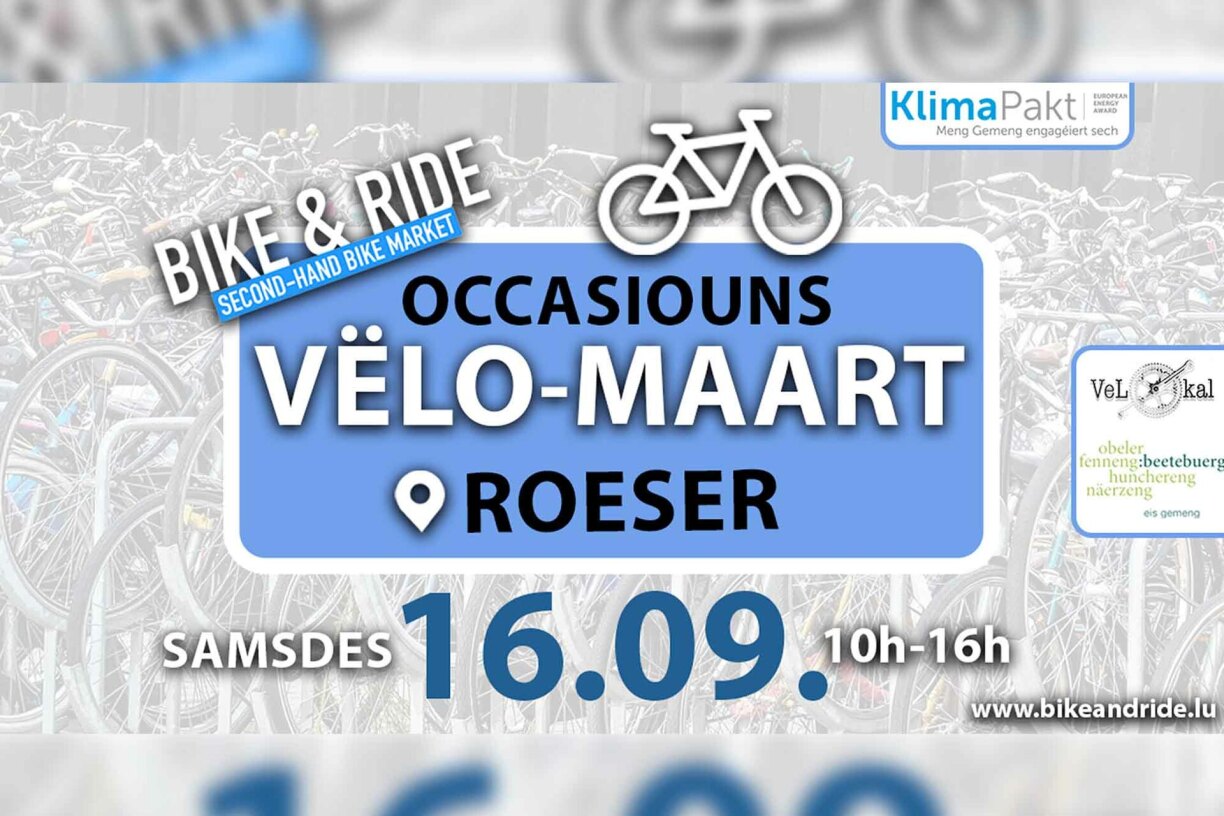Le prochain BIKE & RIDE marché du vélo d’occasion aura lieu le samedi 16.03.2024 de 10h à 16h à Roeser!
