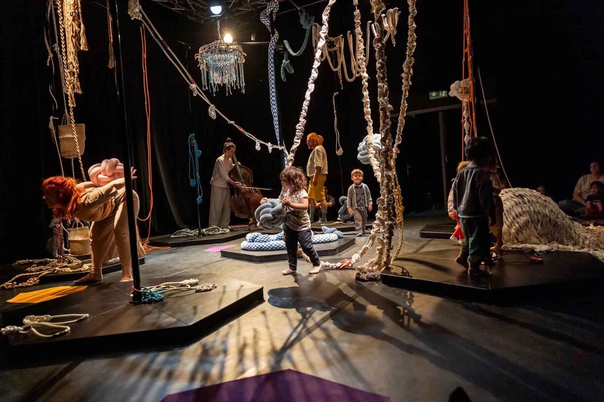 Knuet propose de retrouver ce lien primaire à travers diverses installations cinétiques et sonores. Les tout-petits se laisseront entrainer par trois artistes au sein de grottes, tunnels, hamacs et berceaux. Autant d’installations participatives qui invitent à s’attarder et à s’émerveiller, et où ils/elles découvriront ensemble un monde fascinant fait d’une multitude de nœuds et de tresses.
