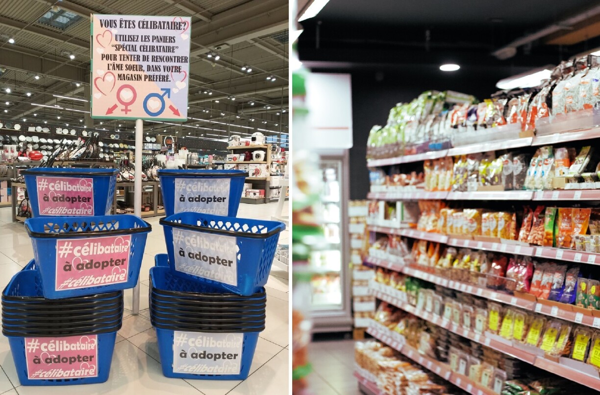 Des paniers avec des pancartes “célibataire à adopter” bleus et roses ont été déposés à l’entrée du magasin. “Utilisez les paniers “spécial célibataire” pour tenter de rencontrer l’âme soeur dans votre magasin préféré” peut-on lire sur un panneau explicatif.