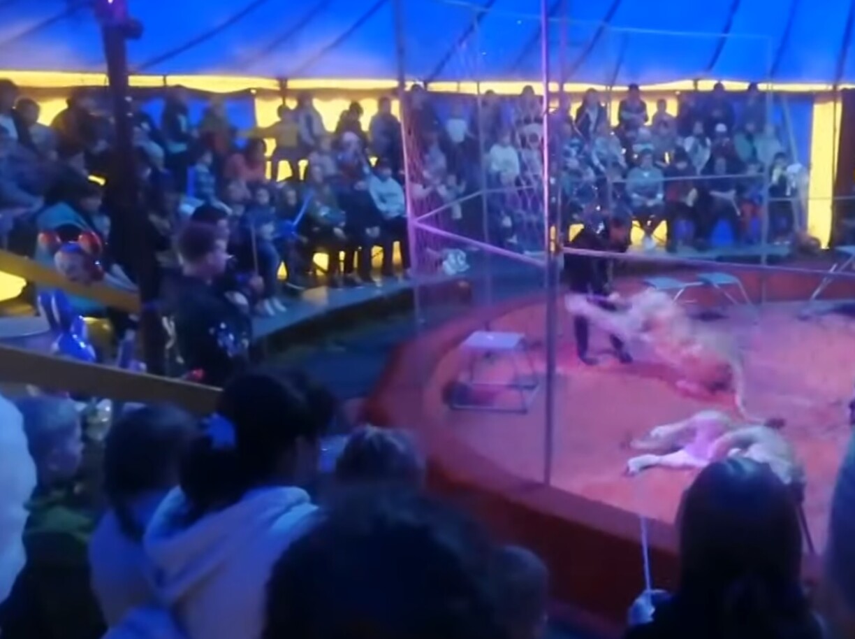 La scène s’est produite lors d’un spectacle de cirque pendant lequel deux lionnes se produisaient sur le ring devant une foule en délire. L’une d’entre elles a réagi à un dompteur qui s’élançait vers elle avec un bâton. Le lion s’est alors jeté sur lui et l’a mordu à plusieurs reprises alors qu’il se débattait sur le sol, comme le montre l’enregistrement.