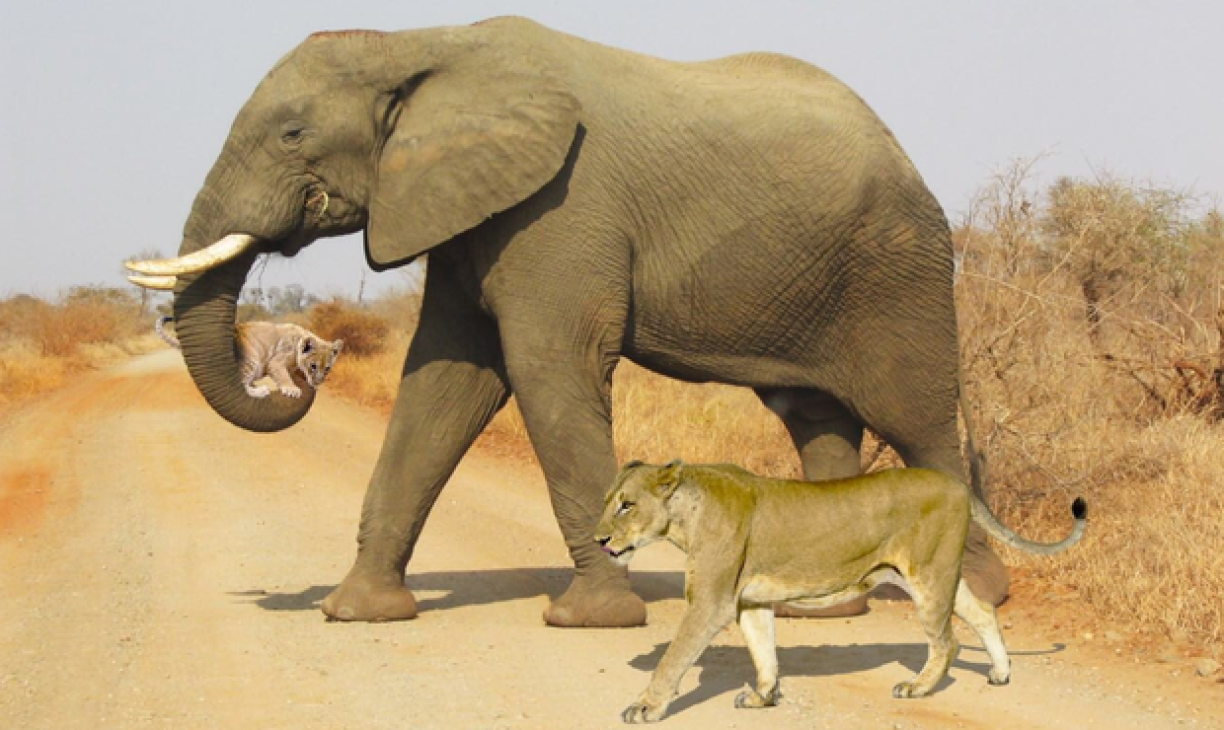 D’après le compte Kruger Sightings, la lionne portait son bébé et commençait à fatiguer lorsqu’un éléphant est intervenu pour l’aider. Le mammifère géant aurait présenté sa trompe et le lionceau serait “monté à bord”.