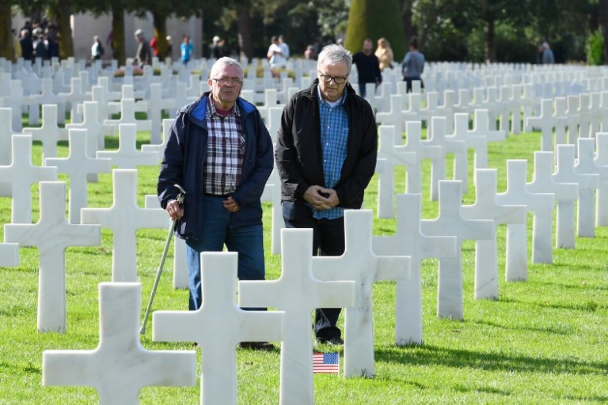 Tous deux en jeans et chemise à carreaux, André Gantois, 72 ans de Ludres (Meurthe-et-Moselle), et Allen Henderson, 64 ans, de Greenville (Caroline du Sud) se sont retrouvés lundi à Colleville-sur-Mer (Calvados) où leur père a débarqué parmi les 132.700 Alliés mobilisés le “Jour J”.