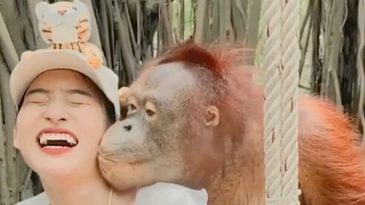 Le singe affiche un large sourire tandis que les gens prennent des photos et filment l’interaction. La femme, bien que surprise, s’esclaffe tandis que l’orang-outan continue à l’embrasser sur la joue.