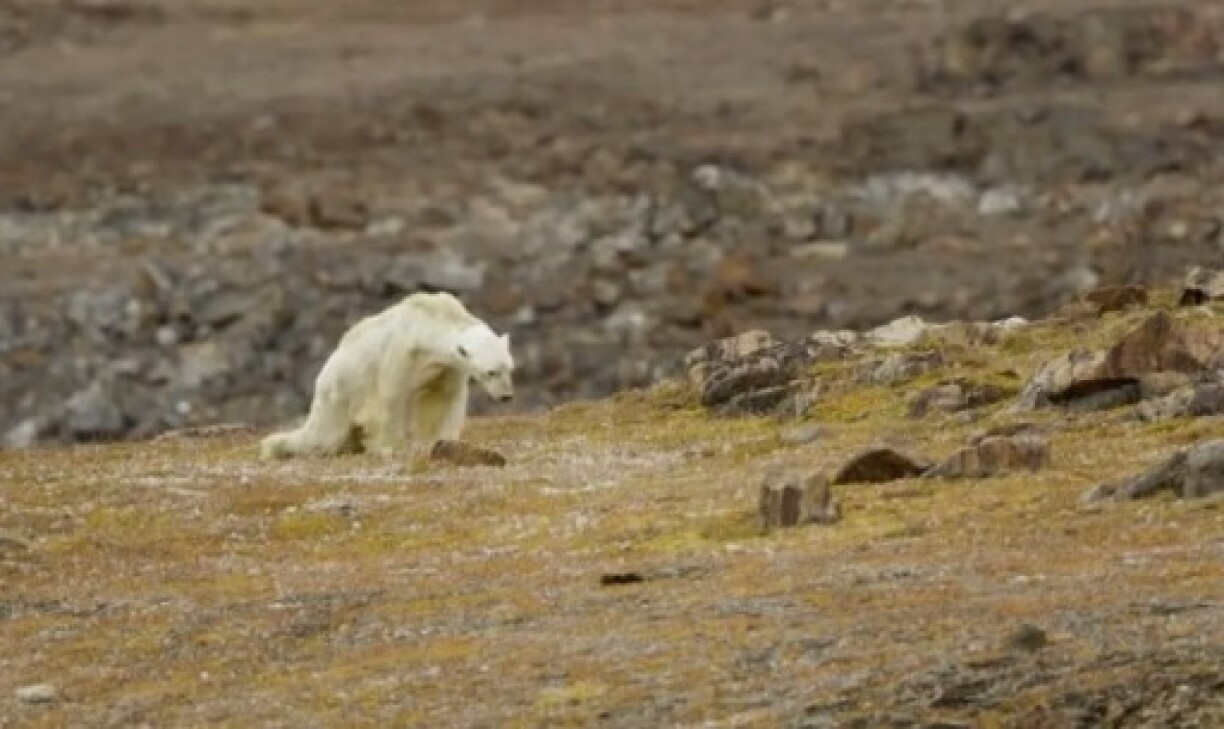 Sa vidéo montre un ours polaire qui se traîne sur une plaine, à la recherche de nourriture. En raison du réchauffement climatique, la glace qui recouvre habituellement cette île du Canada à cette époque de l’année a complètement disparu, faisant fuir les phoques dont se nourrissent les ours.