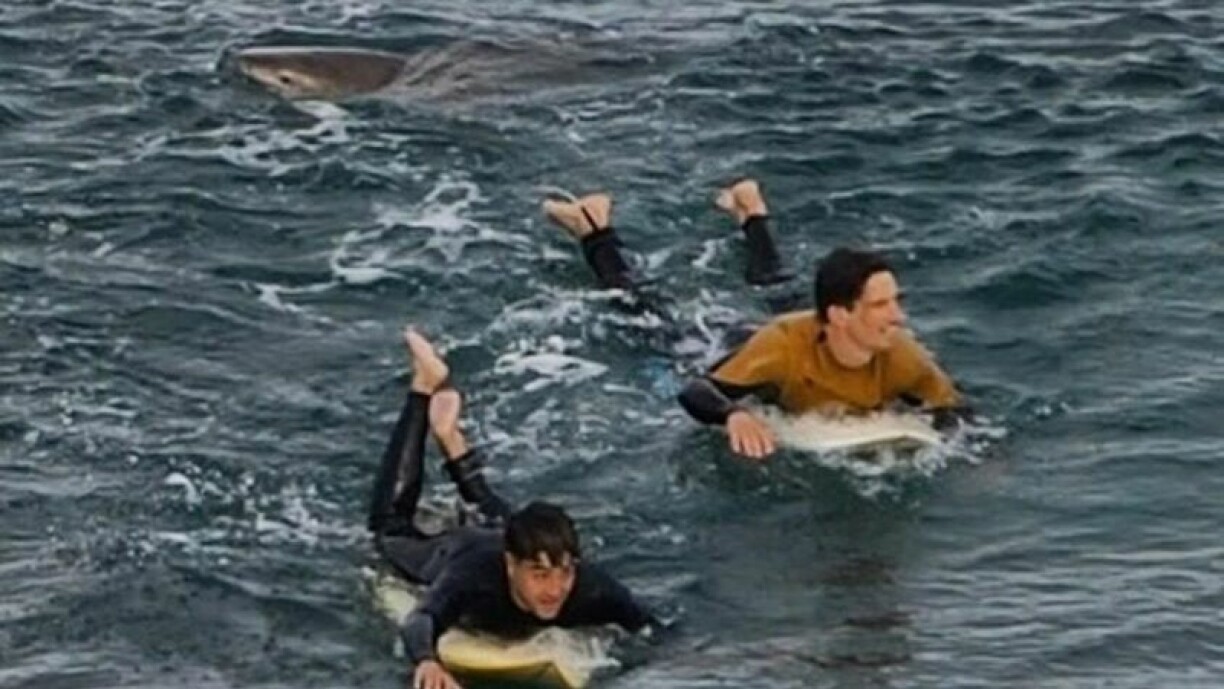 Une vidéo montre un requin à proximité de deux hommes qui nagent sur leur planche vers le rivage.