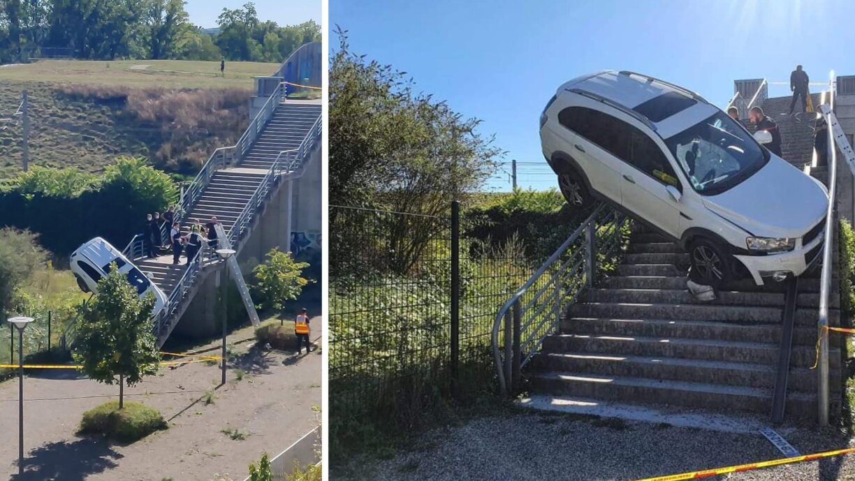 Les clichés sont surprenants: on y voit un SUV coincé dans des escaliers qui se trouveraient, d’après les internautes, derrière un terrain de football à Mulhouse.