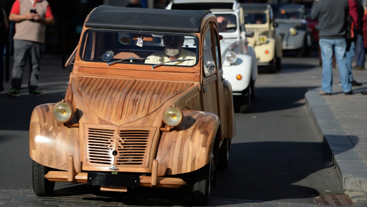 La carrosserie de la 2CV, de type AZKA et datant de 1955, a été entièrement réalisée en bois fruitier par le menuisier et charpentier français Michel Robillard.