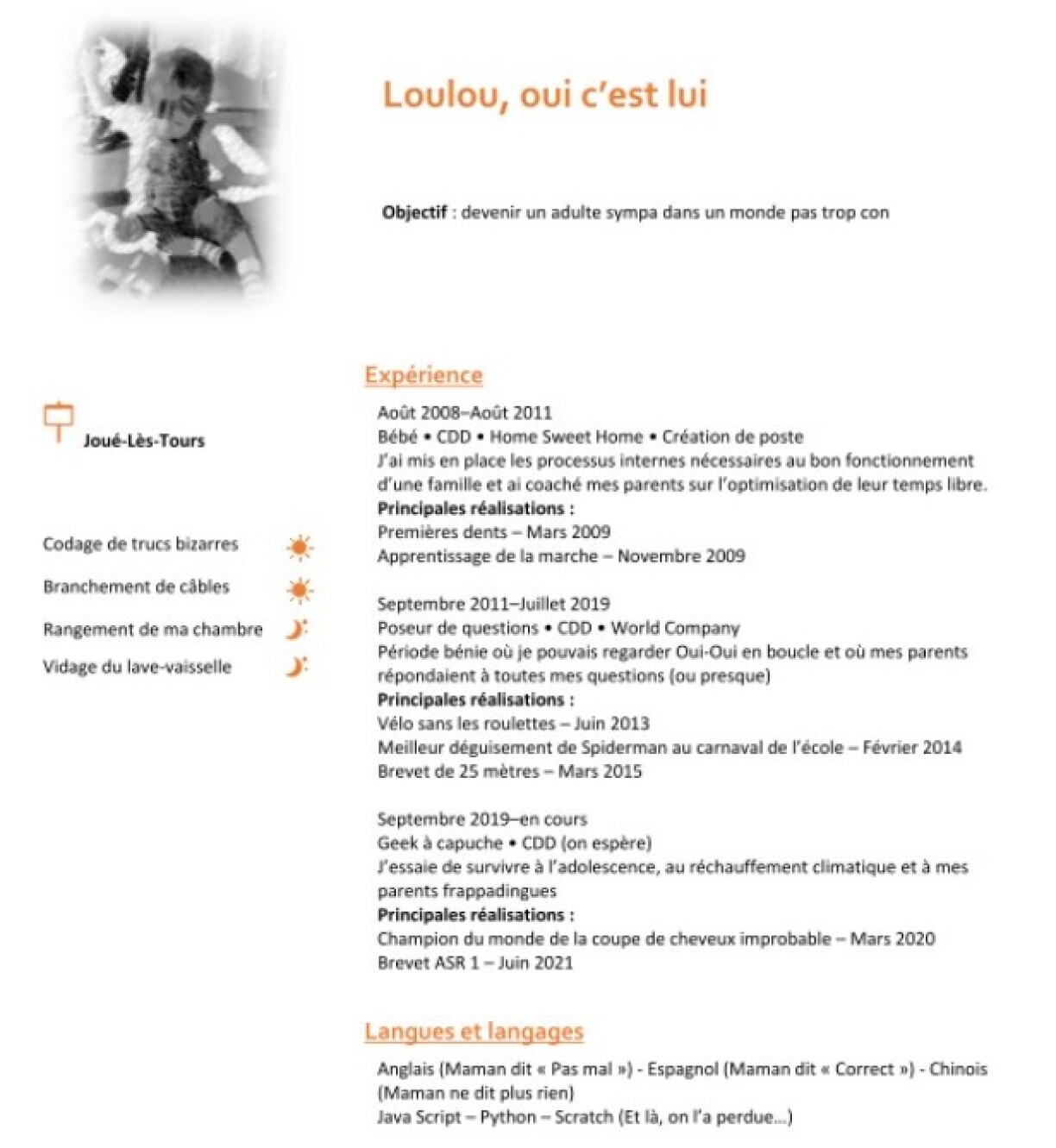 Dans la rubrique expérience on peut lire: “Août 2008 - Août 2011 Bébé. CDD. J’ai mis en place les processus internes nécessaires au bon fonctionnement d’une famille et ai coaché mes parents sur l’optimisation de leur temps libre.”