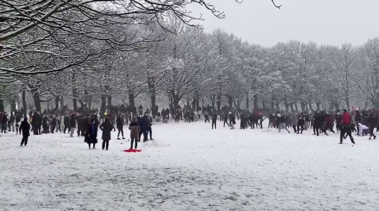 De nombreuses personnes participaient à une bataille de boules de neige. Au total, il y aurait eu près de 200 personnes sur place dont la plupart ne semblait pas respecter les règles sanitaires en vigueur comme la distanciation sociale ou le port du masque.