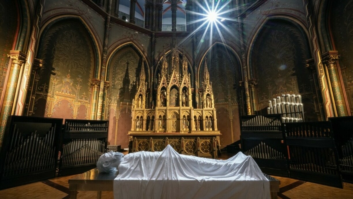 L’œuvre, d’une couleur blanche tranchant avec l’habituelle résine rouge utilisée par l’artiste, représente l’homme d’Eglise sur un chariot mortuaire métallique, un drap recouvrant son corps et laissant deviner une érection.