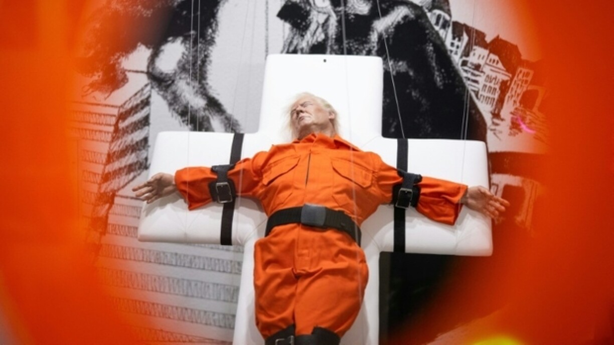 La sculpture de résine intitulée “Saint or Sinner” (“Saint ou pécheur”) représente le président américain en tenue de prisonnier et les yeux clos. Son corps est immobilisé sur une croix blanche matelassée légèrement inclinée.