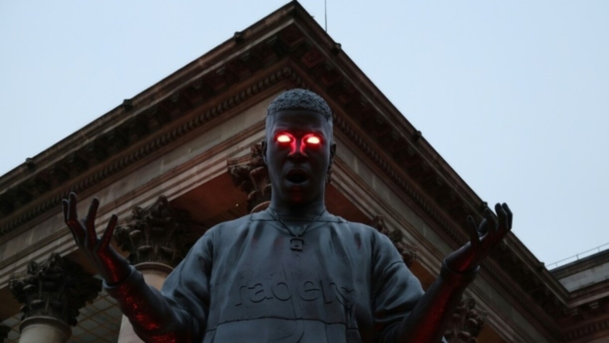 La statue, de plus de dix mètres de haut, de couleur sombre, figure l’artiste dans une posture mi-messianique mi-démoniaque, paumes vers le ciel, tête baissée. Les yeux sont allumés en rouge et la bouche dispose d’un dispositif éclairant testé dans la nuit de jeudi à vendredi pour son installation. Cette œuvre est placée à la sortie du métro Bourse, devant le Palais Brongniart.