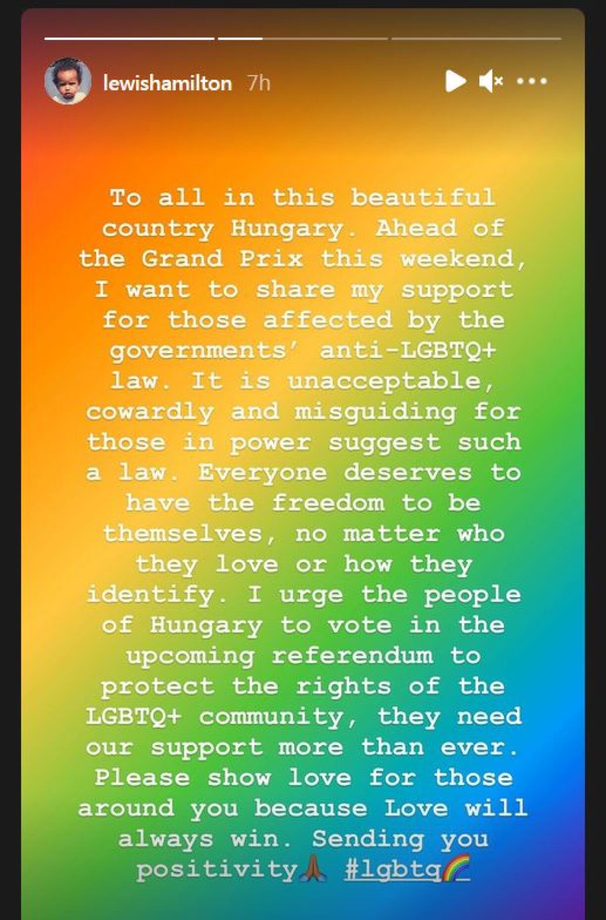 Le septuple champion du monde britannique Lewis Hamilton, militant de longue date contre les discriminations, a indiqué dans un message sur Instagram “qu’avant le Grand Prix ce weekend, je veux faire part de mon soutien à tous ceux qui sont affectés par la loi gouvernementale anti-LGBT+”.