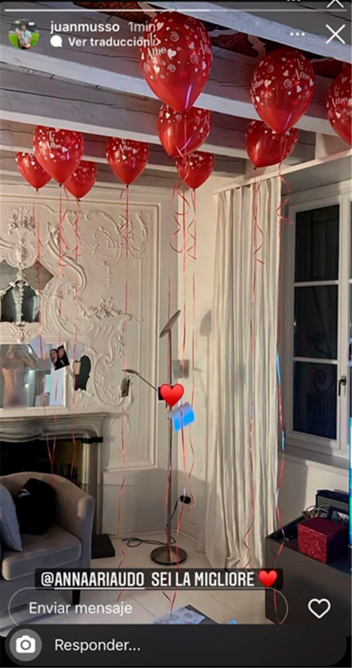 De retour chez lui après la trêve internationale, le joueur Argentin découvre, avec bonheur, la jolie surprise que lui a réservée Anna Ariaudo, sa petite amie. Un gros bouquet de roses rouges trône sur la table basse et des ballons en forme de cœur flottent un peu partout dans la pièce. Une scène que l’Argentin s’empresse de partager sur les réseaux en indiquant à sa chère et tendre qu’elle est “la meilleure”.