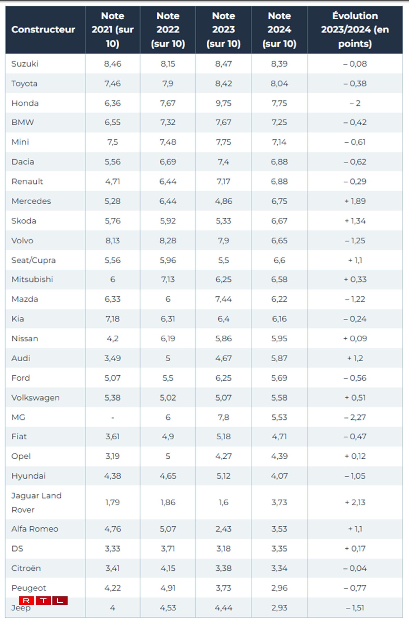 Sans grande surprise, le résultat de cette édition 2024 consacre trois constructeurs japonais qui récoltent les meilleures notes, tandis que Stellantis (Peugeot, Citroën…), englué notamment dans la crise des moteurs puretech, termine bon dernier.