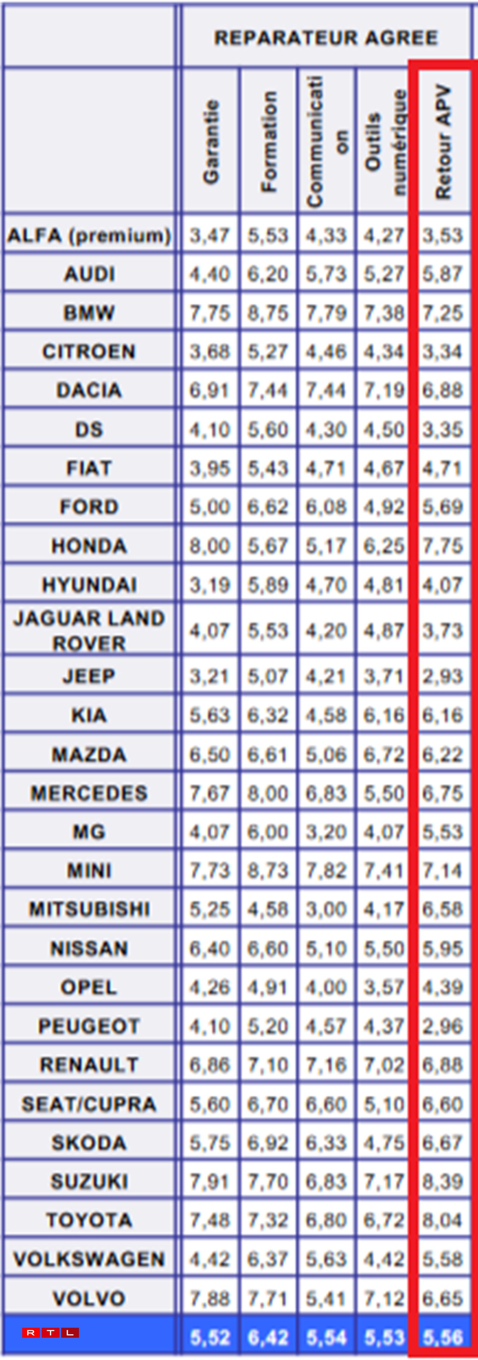 Notons également qu’au classement général de la “Cote d’amour des constructeurs 2024", tous critères confondus (vente, réparation, financement, marketing…), le classement est légèrement différent. C’est BMW qui s’impose devant sa filiale Mini, suivie de Renault, et Mitsubishi (bien que correctement noté en retour de SAV) ferme la marche. Et on retrouve encore le groupe Stellantis dans le bas du tableau avec des notes nettement sous la moyenne.