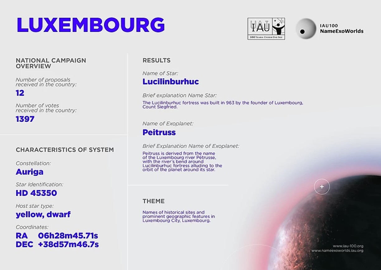 L’étoile HD45350 et sa planète HD 45350b (c’est leur nom scientifique), avaient reçu douze propositions luxembourgeoises, dont trois avaient été retenues et présentées lors du Science Festival en novembre: