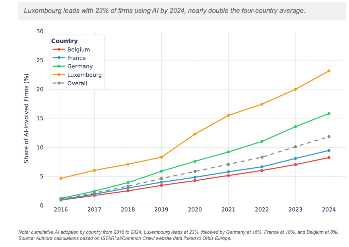 En effet, 23 % des entreprises luxembourgeoises déclarent utiliser l’IA d’une manière ou d’une autre, pour seulement 16 % en Allemagne, 10 % en France et 8 % en Belgique.