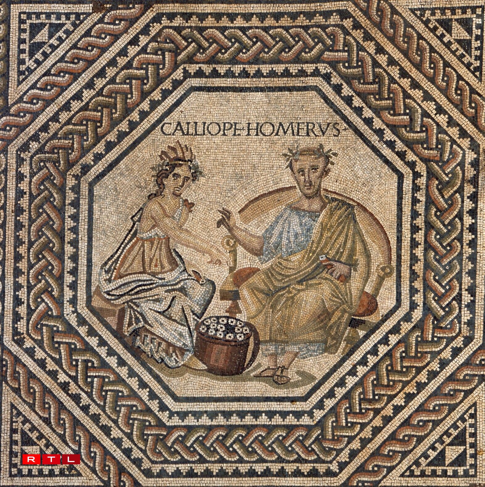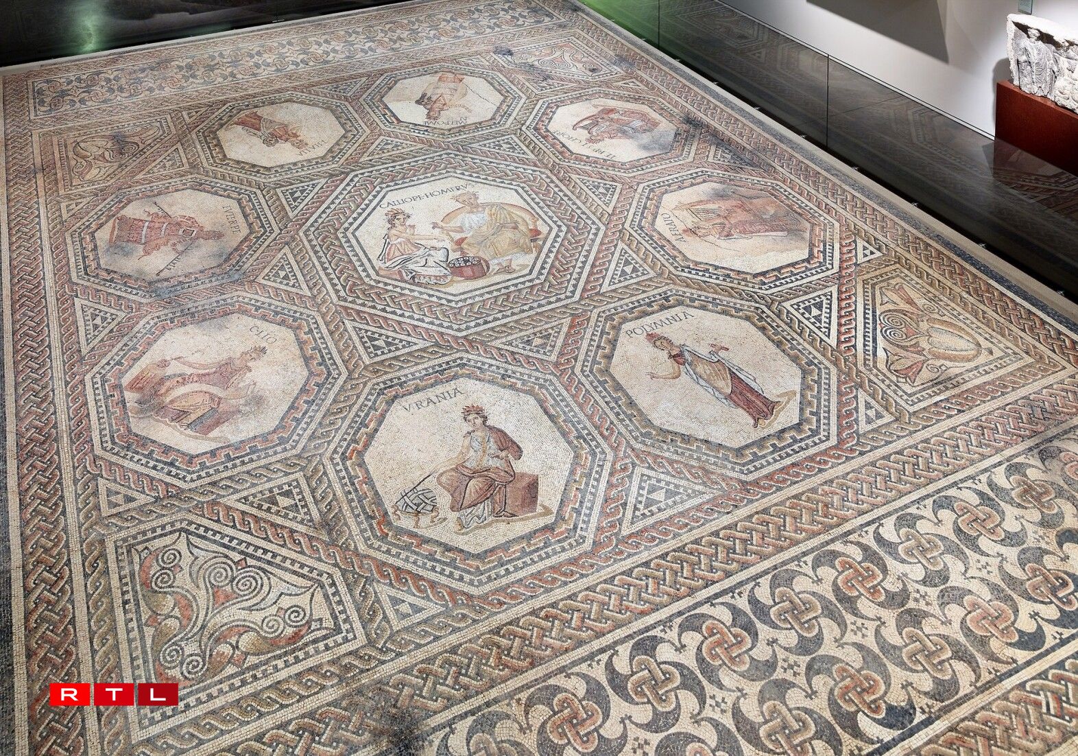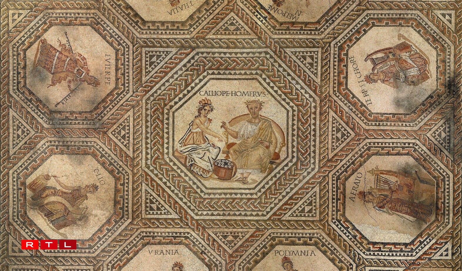 Cette mosaïque gallo-romaine aux neuf muses date du milieu du troisième siècle après Jésus Christ. Selon l’archéologue Jean Krier, cette pièce magnifique est la 47ème mosaïque découverte en Europe représentant des muses, mais l’une des plus belles. On y voit Homère, prince des poètes entouré de Calliope, déesse de la poésie et de huit autres muses: Clio, Muse de l’Histoire – Euterpe, Muse de la Musique et de la Poésie lyrique – Thalia, Muse de la Comédie – Melpomène, Muse de la Tragédie – Terpsichore, Muse de la Danse et des Chœurs dramatiques – Érato, Muse de la Poésie d’amour – Polymnia, Muse du Chant de chœur et de l’Harmonie – Urania, Muse de l’Astronomie.