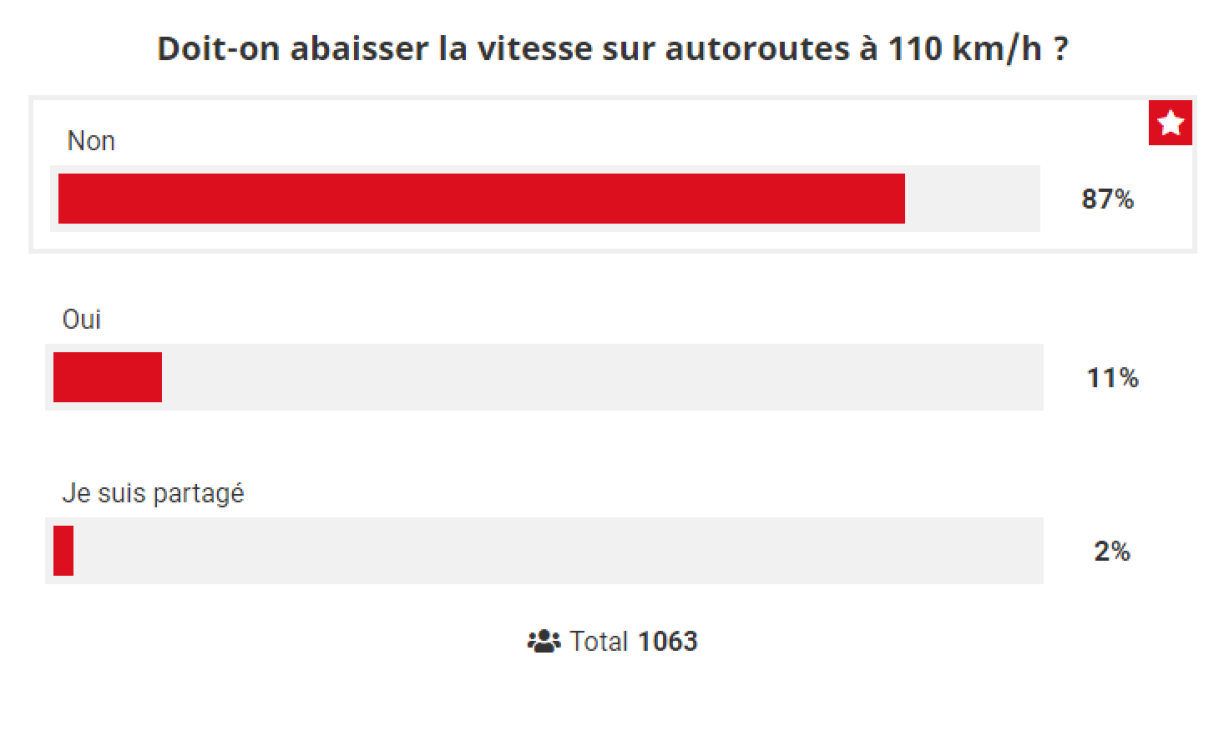 Sur plus de 1.000 participations, vous avez répondu “Non” à 87% à la question “Doit-on abaisser la vitesse sur autoroutes à 110 km/h ?”, que ce soit de l’un ou l’autre côté de la frontière.