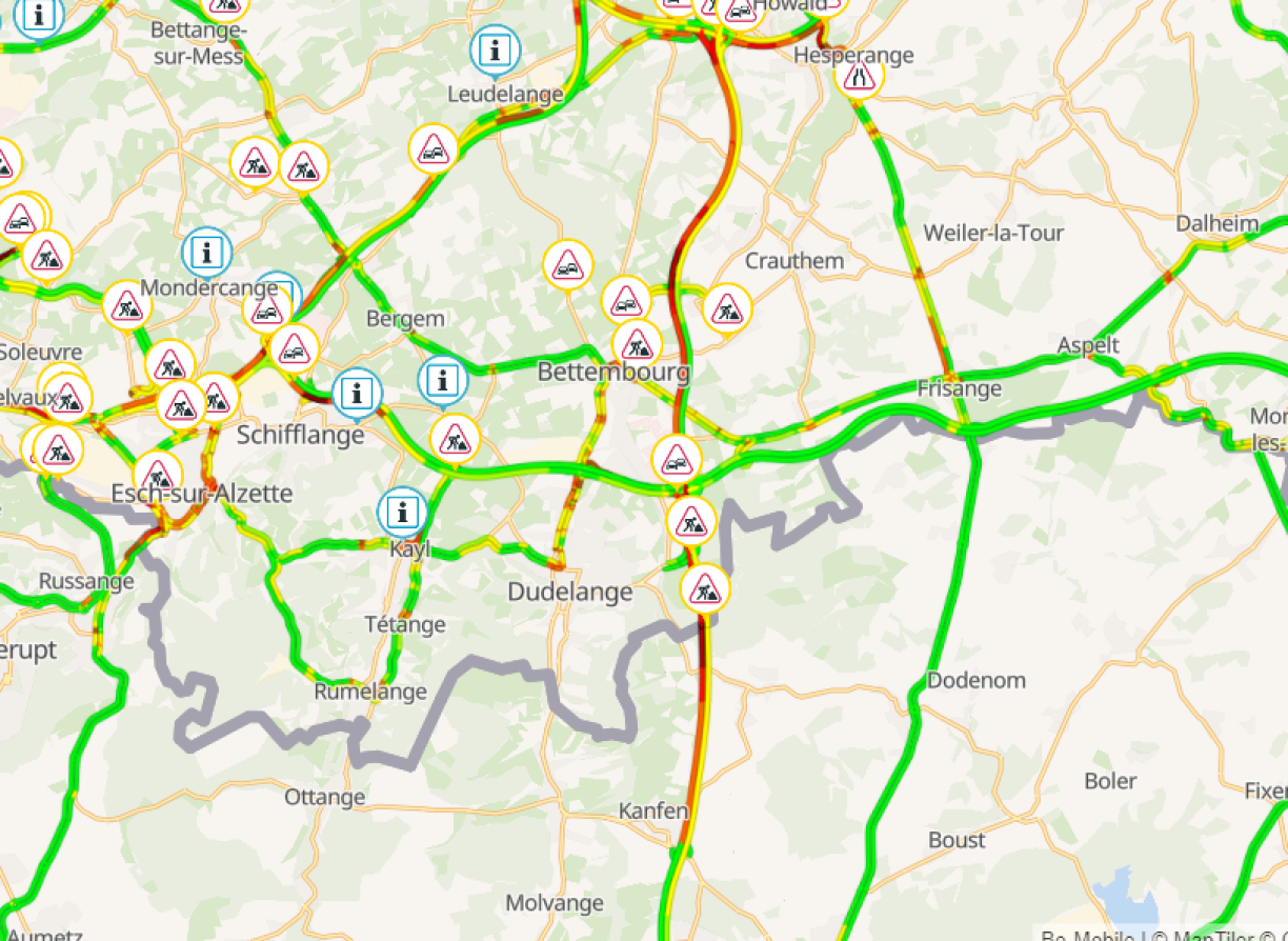 Deux voitures se sont percutées. La voie de gauche est bloquée. Le bouchon qui s’est formé sur l’A3 au Luxembourg remonte déjà jusqu’au niveau de la croix de Gasperich!
