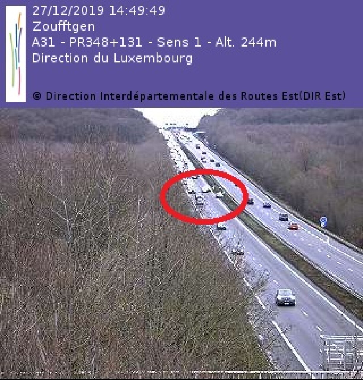 Sur une caméra du réseau de surveillance de la Dir Est, on aperçoit un véhicule sur le terre-plein central et un autre occupant la voie de dépassement.