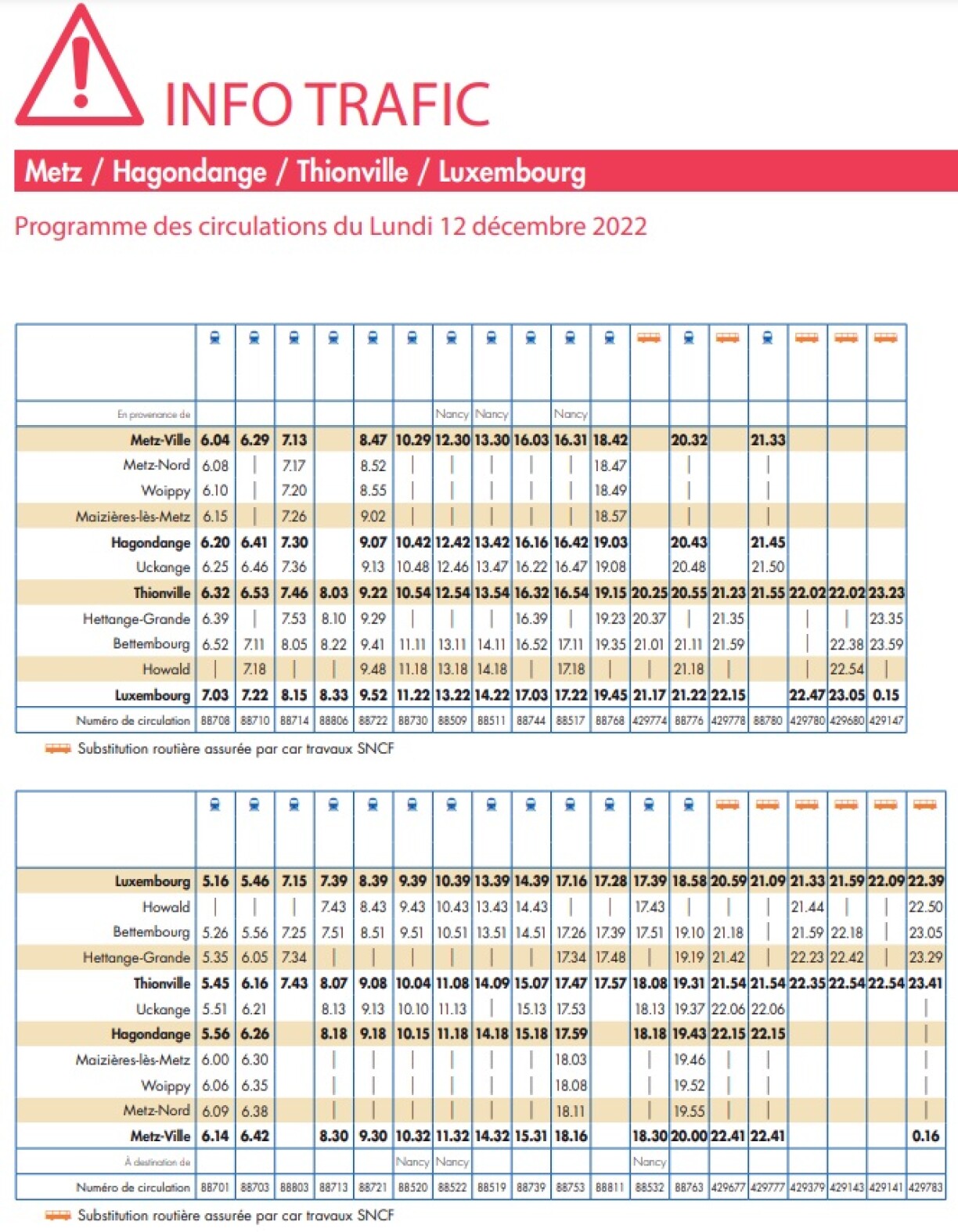 Ainsi, entre 6 et 9h, seuls quatre trains (6h04, 6h29, 7h13, 8h47) assureront la liaison entre Metz et Luxembourg. Même tarif pour rentrer le soir: quatre trains (17h16, 17h28, 17h39 et 18h58... et plus aucun train après!) pour retourner en France.