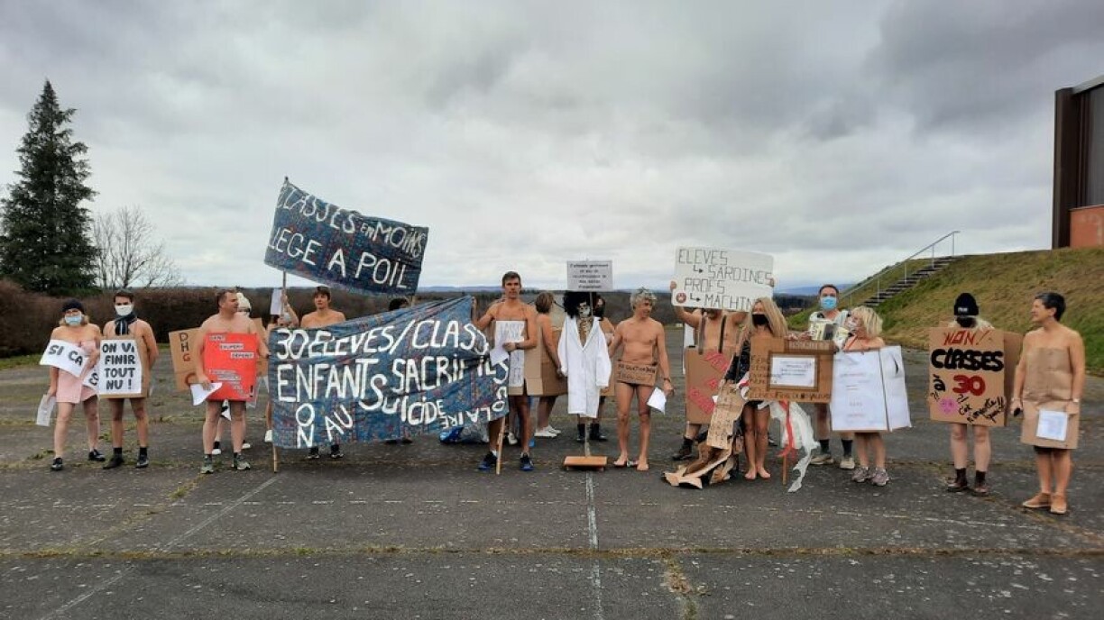 “Classes en moins, collège à poil”, “on va finir tout nu” proclamaient les banderoles brandies vendredi par les enseignants sur un terrain de sport accolé au collège, tandis que leurs élèves, attroupés derrière un grillage, observaient la scène, amusés ou étonnés.