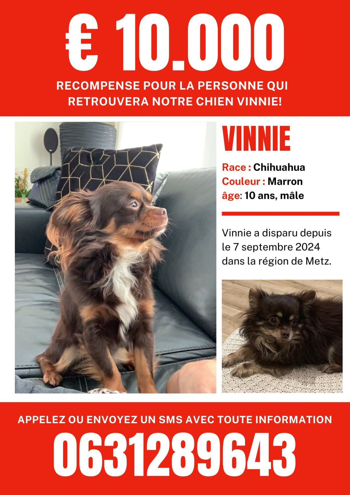 Comme on peut le voir sur un groupe facebook nommé “Retrouvons Vinnie”, qui rassemble plus de 500 membres, les Hollandais promettent 10.000 euros à qui retrouvera et leur ramènera leur chien. Winnie est un chihuahua brun, de petite taille (moins de 30 centimètres de haut). Lors de sa disparition, il portait un collier avec un petit os en pendentif.