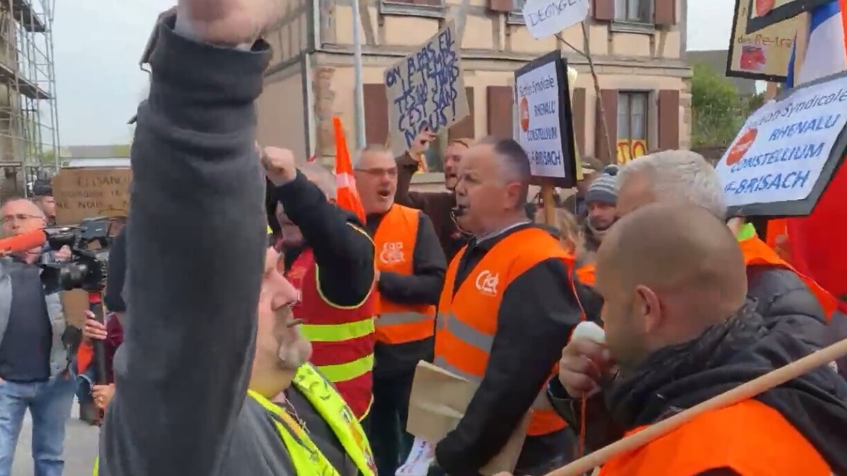 Avant même son arrivée à Muttersholz, une petite centaine de manifestants dont certains revêtus de chasubles CGT et portant une pancarte: “Macron non grata”, ont été repoussés par les forces de l’ordre.