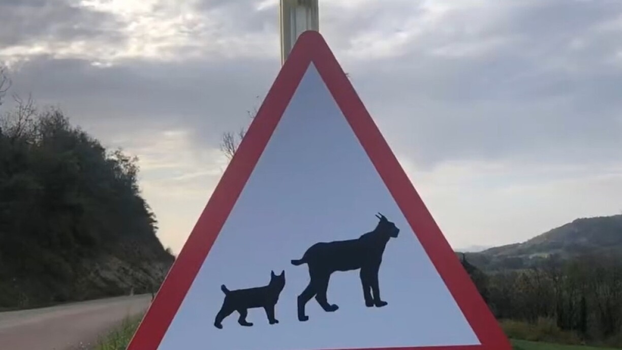 Au centre des panneaux triangulaires en métal réfléchissant, bordés de rouge, l’automobiliste distingue nettement la silhouette noire d’un lynx adulte, suivi de son petit.