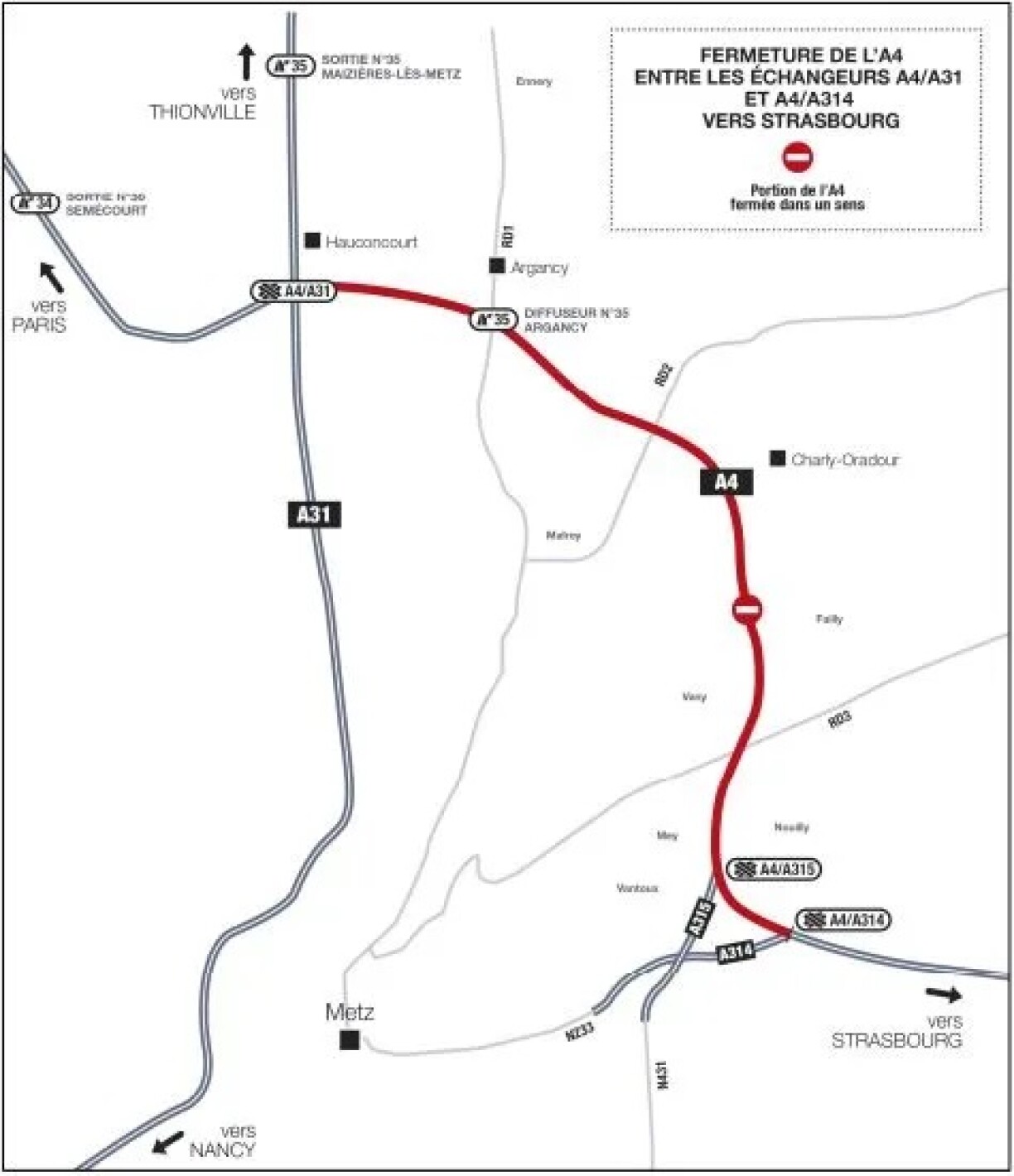 - Durant la même période, les bretelles de l’A31 depuis Luxembourg-Thionville et depuis Metz vers l’A4 Strasbourg et la bretelle d’entrée numéro 35 d’Argancy toujours vers l’A4 en direction de Strasbourg seront également fermées.