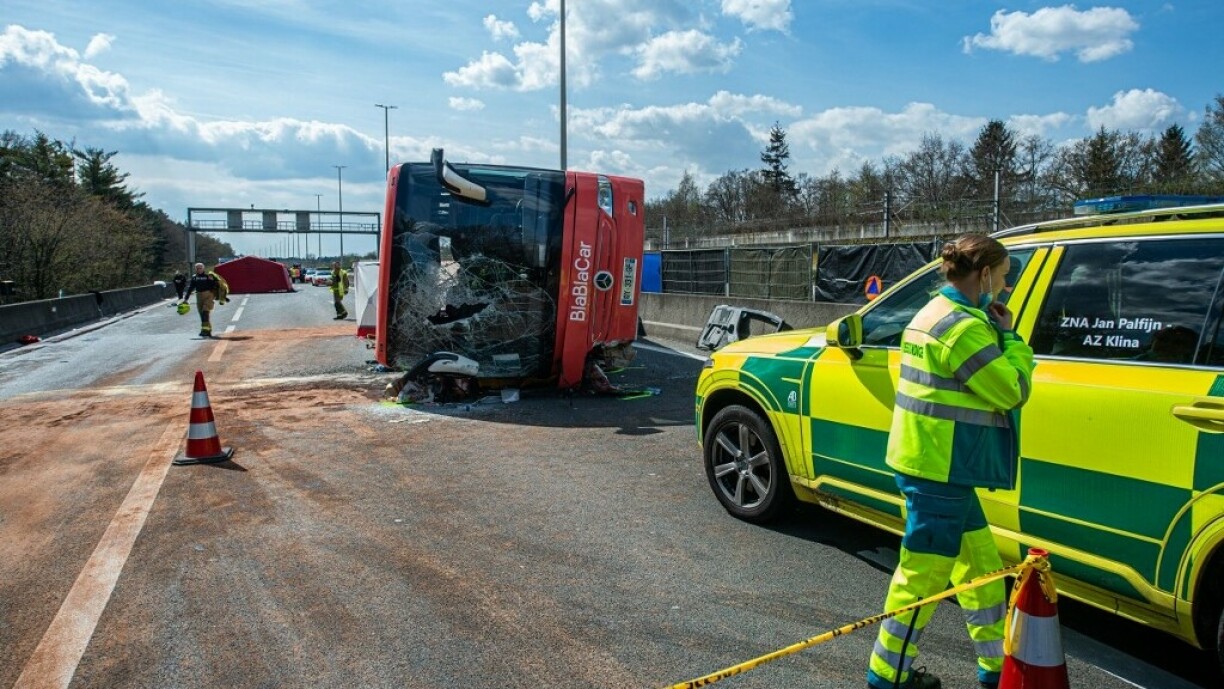Le car rouge de BlaBlaCar s’est couché sur le flanc, pare-brise brisé, selon les photos de l’accident après avoir dévié de sa trajectoire et percuté le rail en béton bordant l’autoroute.