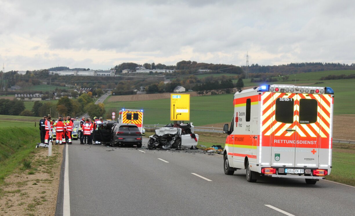 La police indique qu’une BMW roulait en direction de Gerolstein avant de se déporter sur l’autre côté de la chaussée pour une raison encore inconnue. C’est à ce moment que la collision entre la première voiture et trois autres véhicules circulant dans le sens inverse s’est produite.